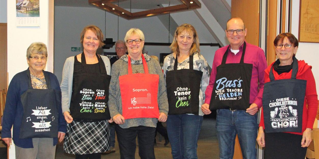 Die bisherigen Vorstandsmitglieder erhielten von den Sängerinnen und Sängern des Gemischten Chores Taschen zum Abschied; von links: Notenwartin Elisabeth Engelbrecht, 1. Vorsitzende Claudia Hedrich, Kassiererin Heidi Berndt, Schriftführerin Anja Laurich, 2. Vorsitzender Jürgen Düster und Chorleiterin Agnes Storz. Die Taschen wurden jeweils mit einem lustigen, von Christine Rüddenklau verfassten Gedicht überreicht. (Foto: Brunhilde Berndt)